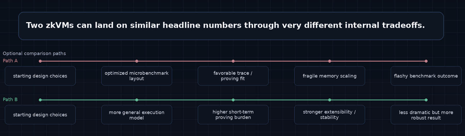 A zkVM may look attractive on one stage of the pipeline while pushing complexity into compilation, witness generation, trace expansion, or operational burden.