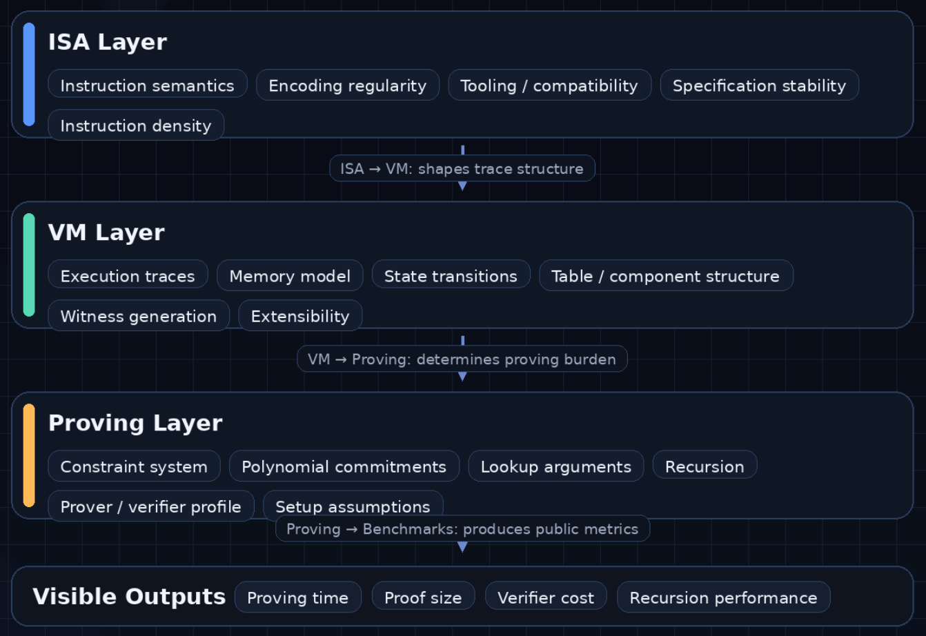 This is especially true in ZK systems because costs move between layers. A cleaner ISA may simplify one part of the stack while complicating another. A VM architecture that is pleasant for modular constraint composition may impose different witness-generation costs. A proving backend that looks excellent on one trace layout may be much less attractive once memory pressure, lookup structure, or recursion requirements change. Performance claims are often real, but they are rarely complete.