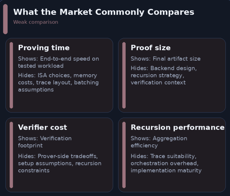 This is also where public comparisons become easiest to misread. Prover performance depends on implementation maturity, hardware assumptions, batching strategy, field choice, recursion depth, and workload selection. Without context, benchmark numbers often function more as backend advertisements than as meaningful system comparisons.