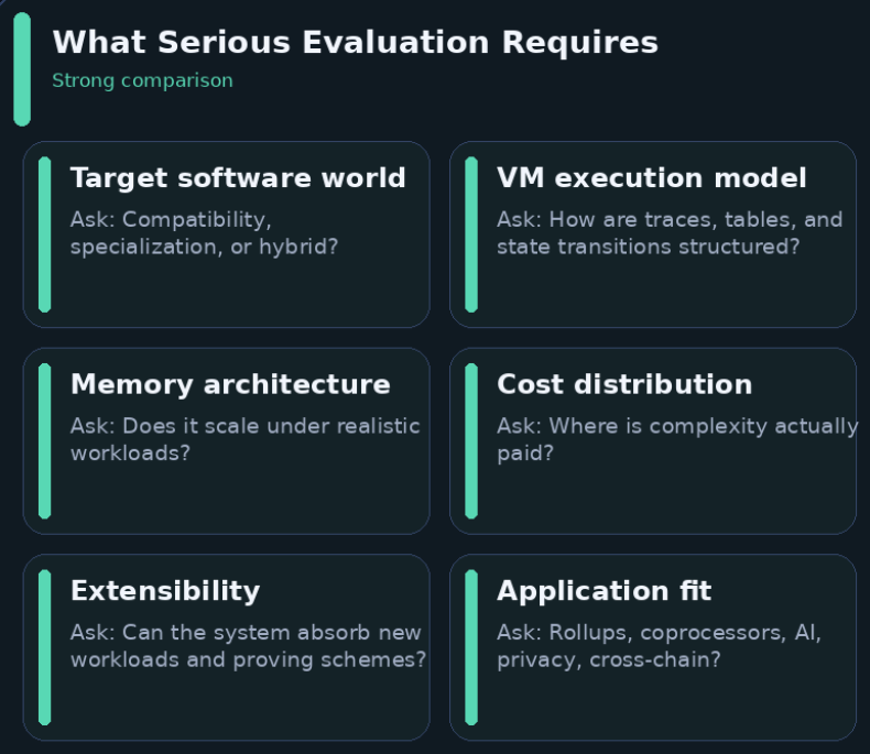 Rollups, coprocessors, verifiable AI, private computation, and cross-chain verification do not weight the same metrics equally.